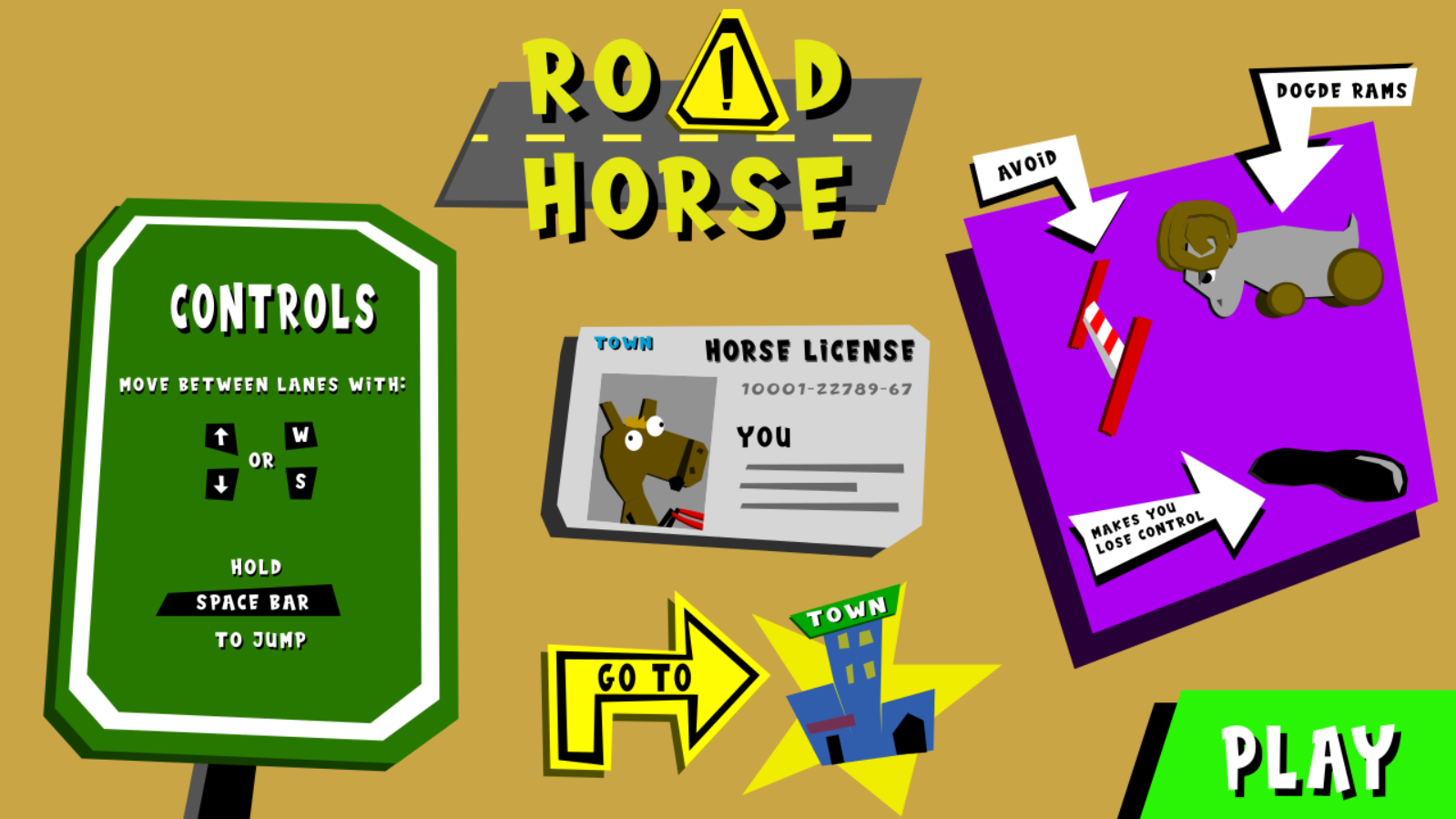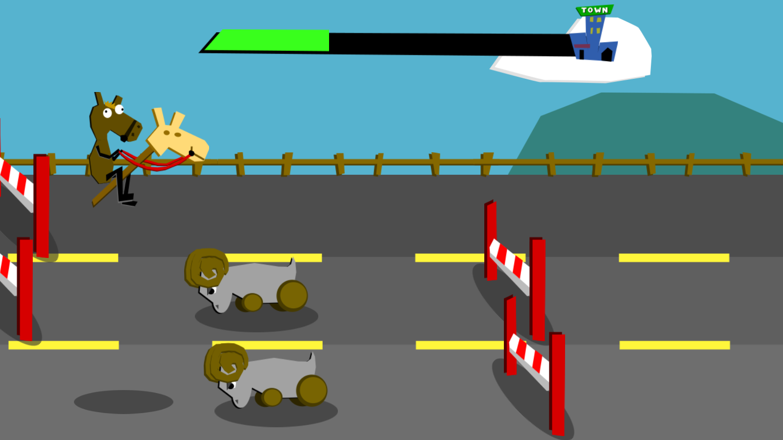 With your trusty Horse, avoid Rams and road blocks while trying to reach the town! If you step on oil, you will be unable to move for a few seconds. Be sure to JUMP to get out of sticky situations!